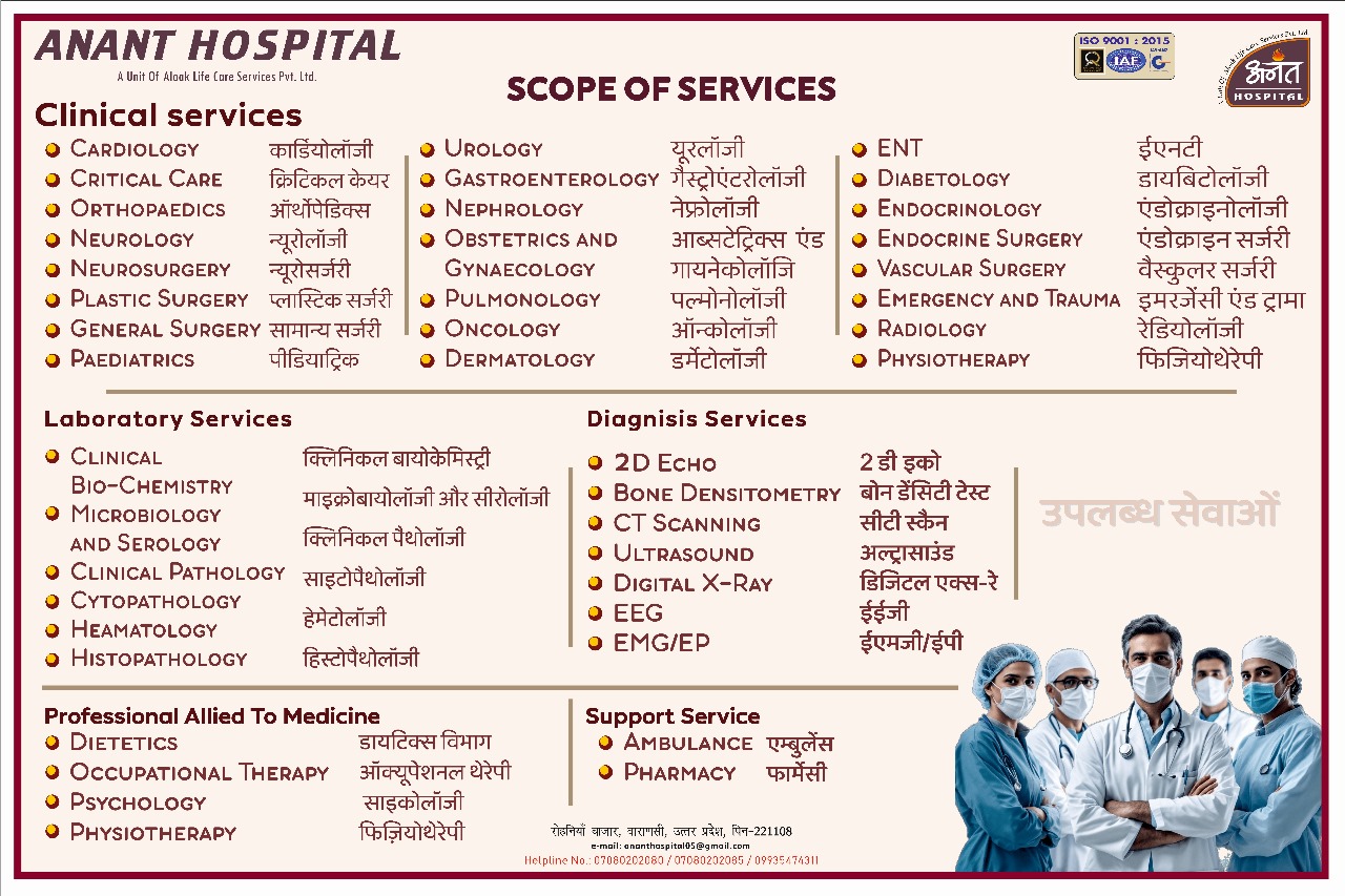 ANANT HOSPITAL (A unit of Aloak Lifecare Services Private Limited), one of Varanasi best Multi Super Speciality hospital that redefines standards of excellence in healthcare delivery by bringing together the best of infrastructure, technology, training, education and medical intelligentsia. Anant Hospital is a 100 bedded Multi Super Speciality Hospital in Varanasi providing all kinds of Medical, Surgical & Diagnostic services to the patients of Eastern UP, Bihar, Jharkhand, Chhattisgarh and MP for more than 7 years. We provide best services under one roof like Cardiology, Nephrology with Dialysis, General Medicine, TB & Chest, General Surgery, Neurology & Neuro Surgery, Obs & Gynecology, Urology, Oncology, Pediatrics (Surgery & Medicine), Orthopedics including joint replacement, ENT.